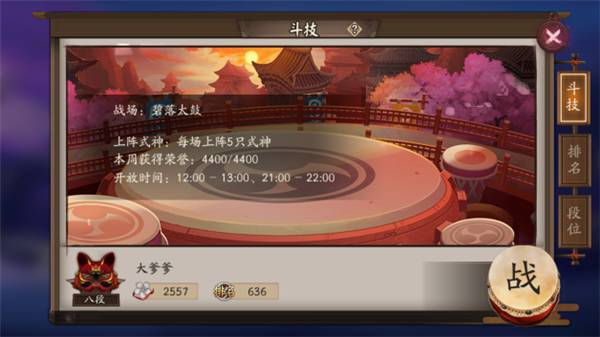 13、斗技:每天中午12:00和晚上21:00开始,现场PVP,双方都是玩家操作,真正检验队伍实力。胜利获得积分,失败会扣取少许,输赢都能获得荣誉积分,可以换蓝票和SSR碎片哦。斗技的技巧问题后文详述。