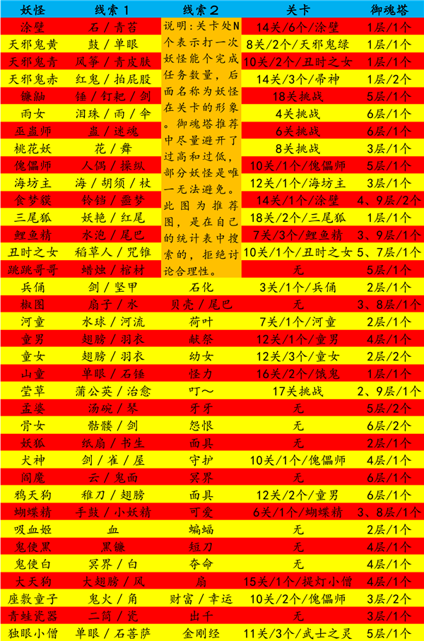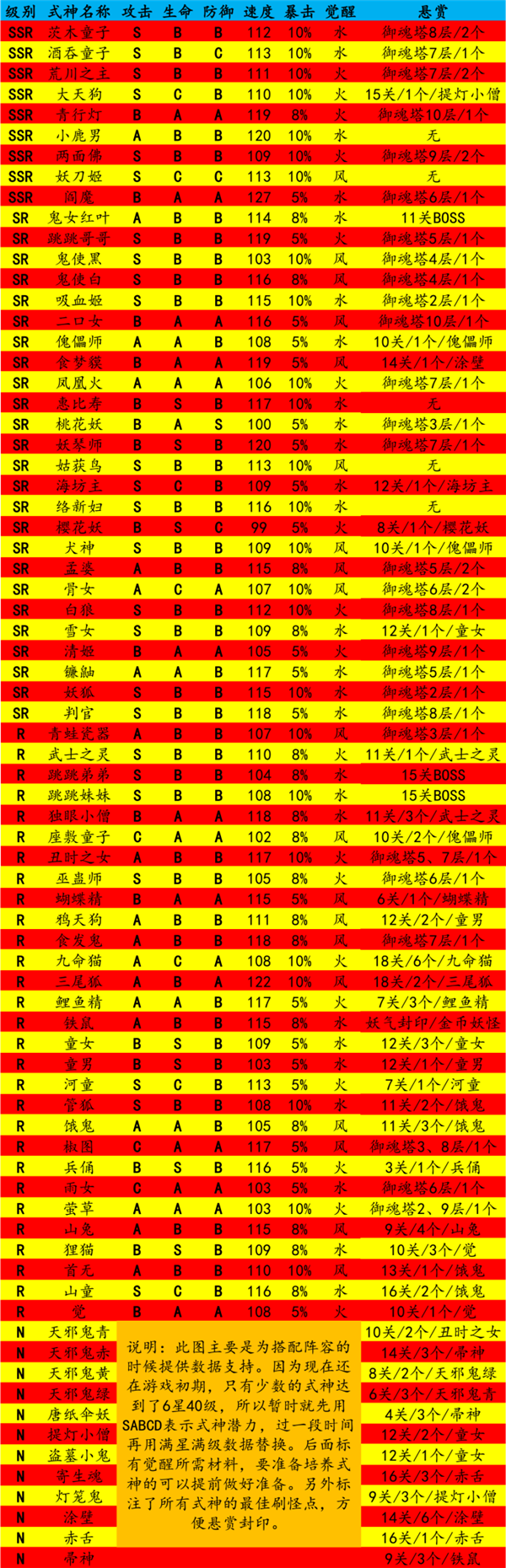 每天晚上都能在世界频道听到很多人在一起讨论某某式神攻击爆炸了,某某式神可以天下无敌了。这些都是很片面的说法,因为这个游戏是五个式神的游戏,每一个式神都有他独特的作用,与不同的式神搭配就能产生不同的效果,赋予他们不同的御魂就能产生不同的作用。弱如食发鬼这样的冷门式神,当与山兔等配合,居然可以在现阶段无伤过御魂十。强如茨木大天狗,我也没见过谁五个茨木或者五个大天狗能过了御魂十。所以用自己已有的式神怎么组合出自己的最强阵容,这就需要全面的了解这些式神。这一段主要是把式神的基础数据写出来,方便以后使用的时候查阅。具体如何搭配,进阶篇再讨论。图表中包含悬赏最佳地址。
