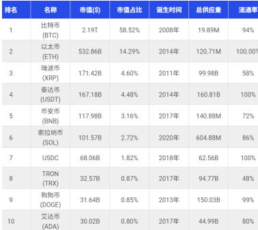 市值排名靠前的虚拟货币往往有更高的市场关注度,不仅因为它们是优质项目,具有许多显著的优点,而且往往是板块的龙头,具有风向标的指引作用。下面我们就以市值为参考列出当前虚拟货币排名top10。