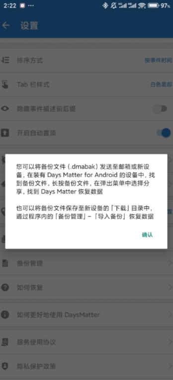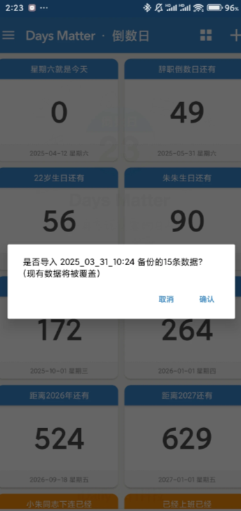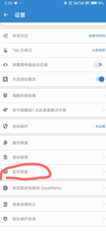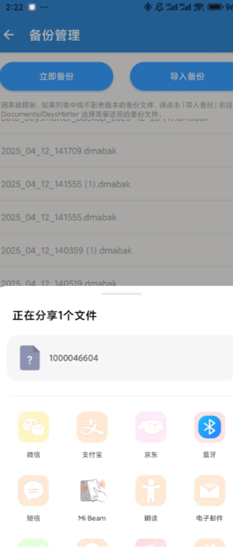 后面有时间→我们点一下会出现分享→我们分享给自己小号或者你谁都行→然后点那个数据→他会弹出一个倒数日我们直接点就行他会直接弹到倒数日APP→接下来点确定数据就恢复了