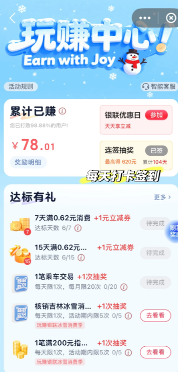 乘车、冰雪旅游、购物满200元……这些日常消费全部被转化为抽奖机会。每月最多可通过乘车交易拿到20次抽奖,冰雪季活动还有额外机会。一边生活,一边抽奖,惊喜可能就在下一笔订单中。