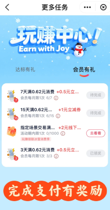消费不再是单纯花钱,而是“赚钱”的机会!完成“7天消费满0.62元”之类的小任务,就能领取1元立减券。用券支付,相当于每次省下一笔,轻松实现“越花越省”。