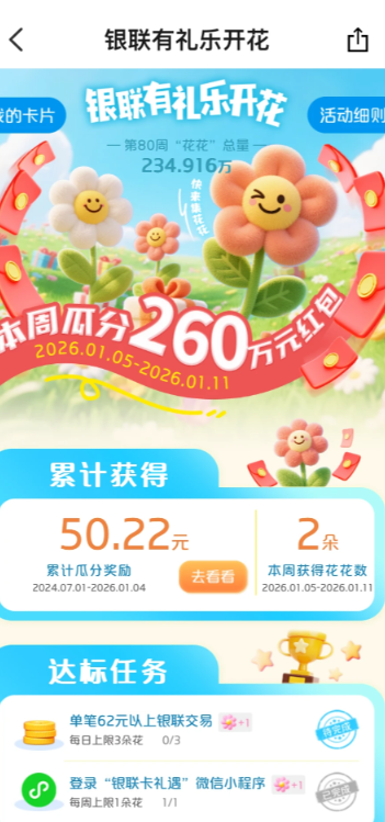 ⑤银联有礼乐开花每周轻松分红包!只要单笔消费满62元:每天最多3朵,每周理论可拿21朵。实战建议:每周集中1天消费1笔62元以上,即可拿到当天的3朵。可用场景:超市购物、充话费、线上购物(支付时选银联)。